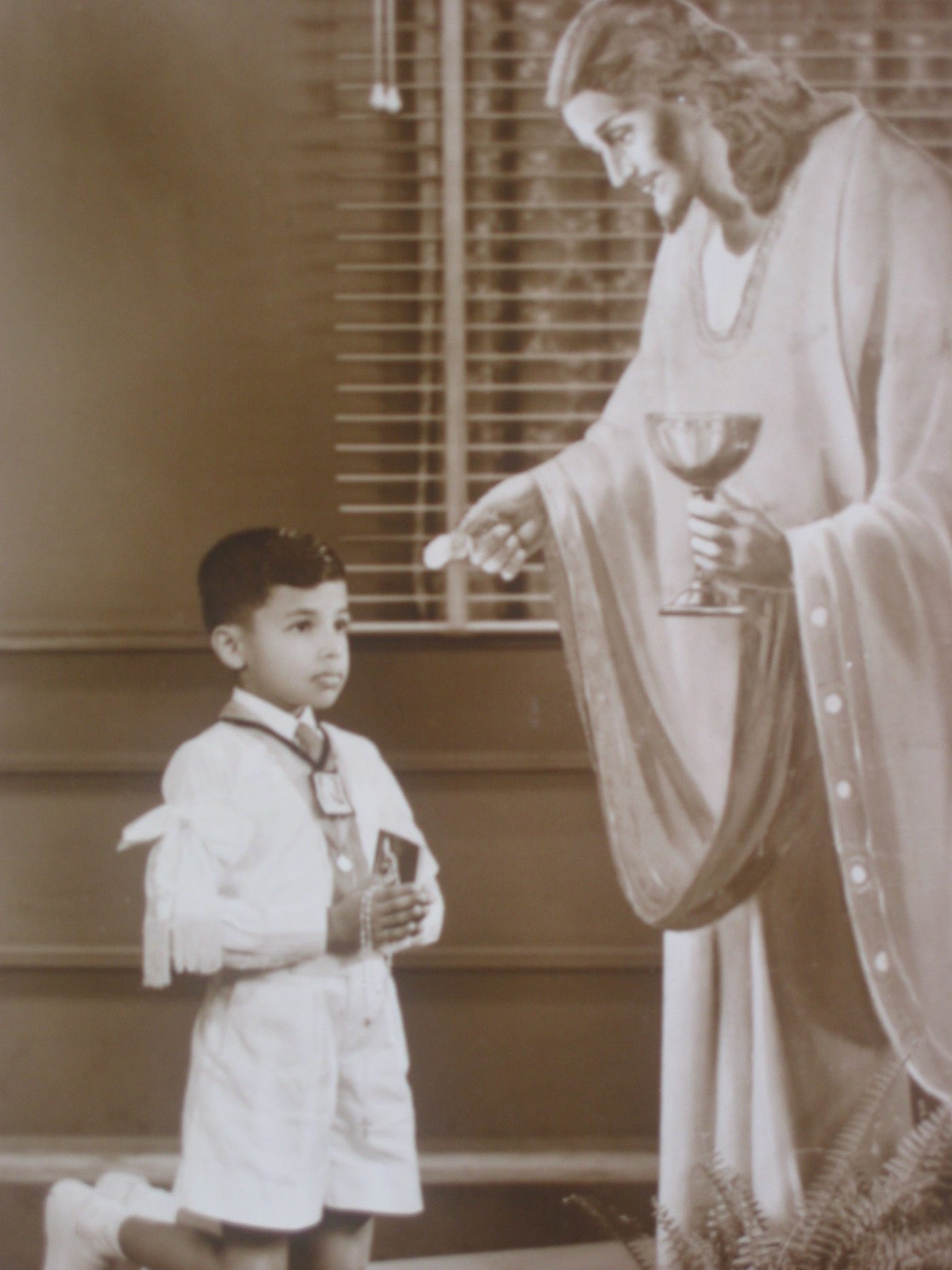 Denzil’s first holy communion photo at seven years of age, with a mass book and a rosary in his hand.