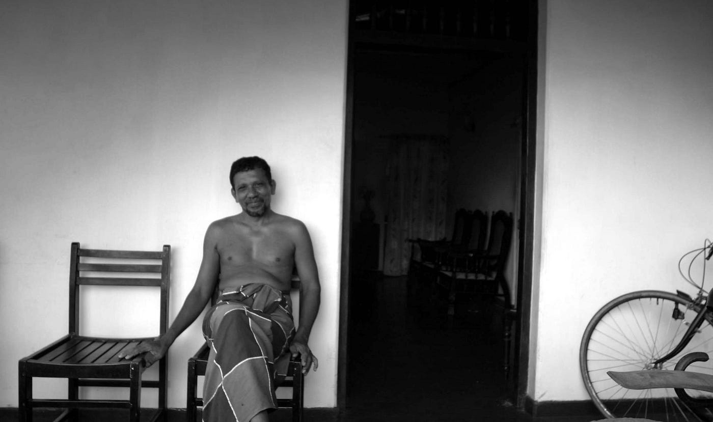 We entered the house surrounded by coconut and banana trees. A dark, tall man sitting on a chair at the house's entrance welcomed Cyril. He was bare-chested, wearing a white sarong. The man in his fifties smiled at me and asked Cyril whether I was his brother. ‘No, uncle, he is my friend,’ replied Cyril, and both exchanged pleasantries.