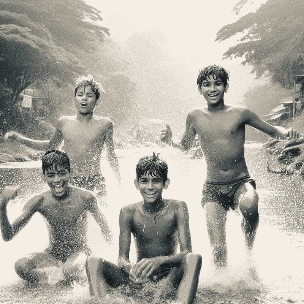 We four lads, perhaps perceived as oddities or menaces by some, were merely pilgrims on the path to enlightenment. Our quest was not for the mundane but for a heightened consciousness while the world around us chased fleeting joys through judgment, duty, and idealism. They sought power and glory; we sought harmony with nature’s intent for renewal, solitude, and the dawn of what’s to come. Our communal dips in the river with the Martins and the local boys stripped away all pretence, and in this raw freedom, I revelled. We were bound by a collective tenacity. Youth, to us, was not a fleeting chapter but a landscape to be cherished and explored. We were pioneers venturing toward an unknown future, a future uncharted and undefined.